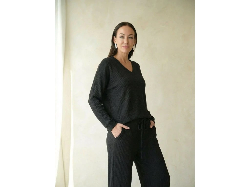 Elegantní svetrový komplet Chic Vibe z jemného a příjemného materiálu připomínajícího lehký svetr. Horní díl s výstřihem do „V“ a pohodlné kalhoty s pružným pasem vytvářejí stylový a velmi komfortní outfit.