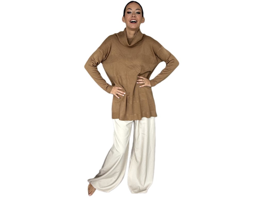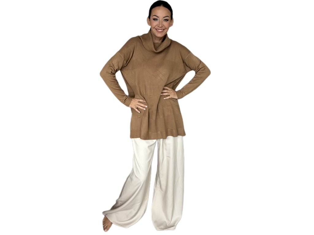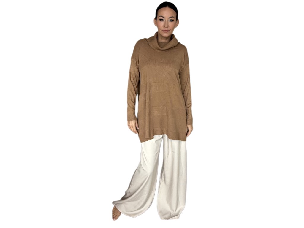 Tenká viskóza je hebká, prodyšná a krásně splývá po těle. Volnější střih s delší délkou lichotí postavě, schová co má a zároveň působí elegantně. Rolák jemně obepne krk, ale netlačí – ideální i na celodenní nošení.