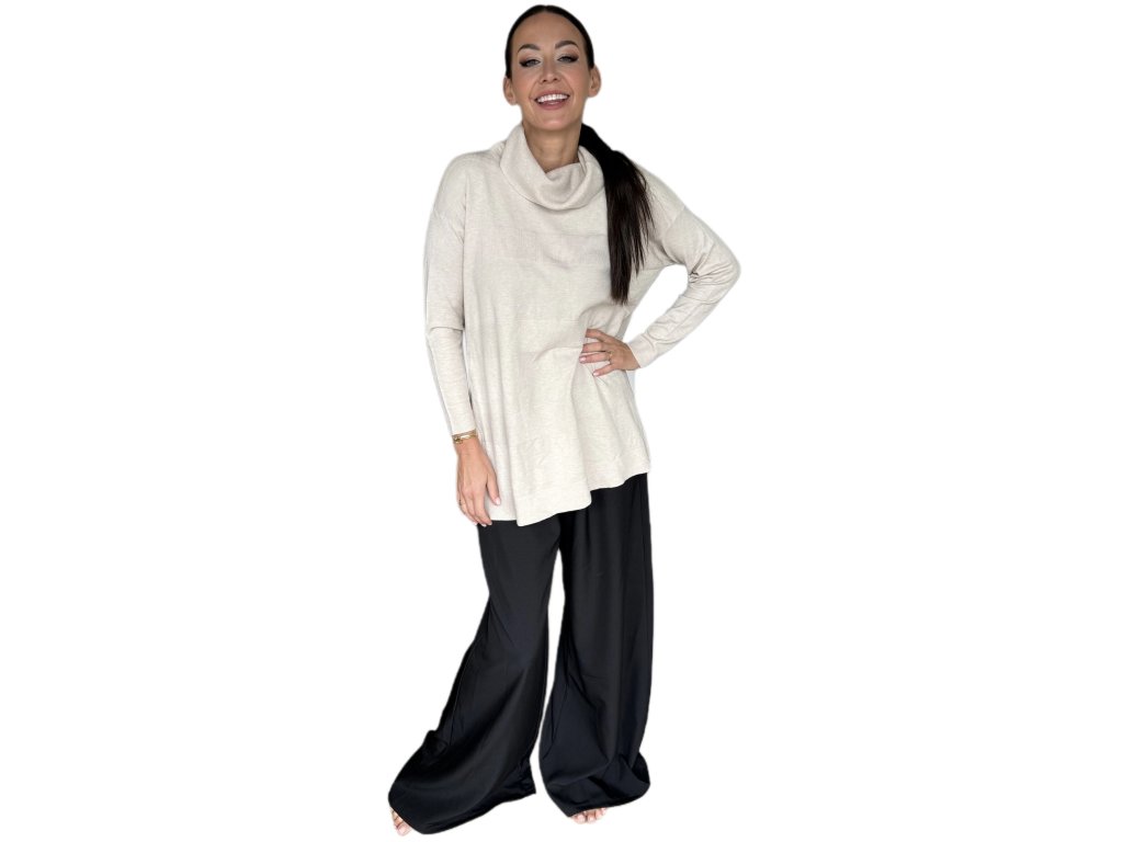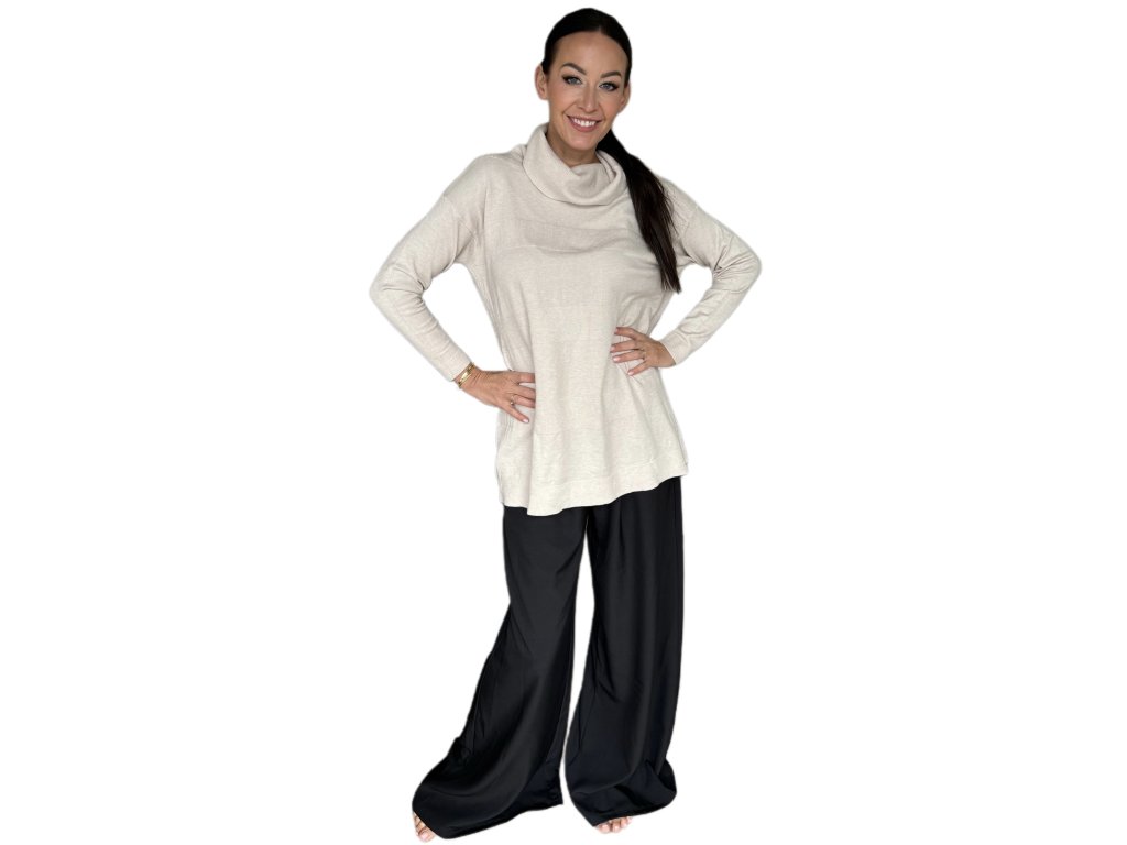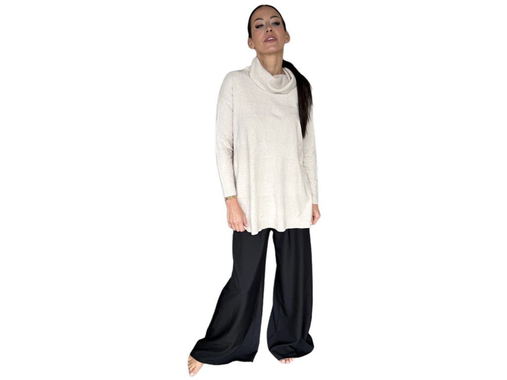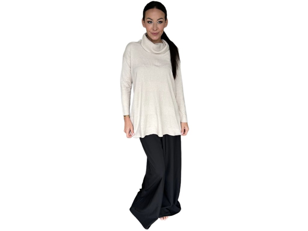 Tenká viskóza je hebká, prodyšná a krásně splývá po těle. Volnější střih s delší délkou lichotí postavě, schová co má a zároveň působí elegantně. Rolák jemně obepne krk, ale netlačí – ideální i na celodenní nošení.