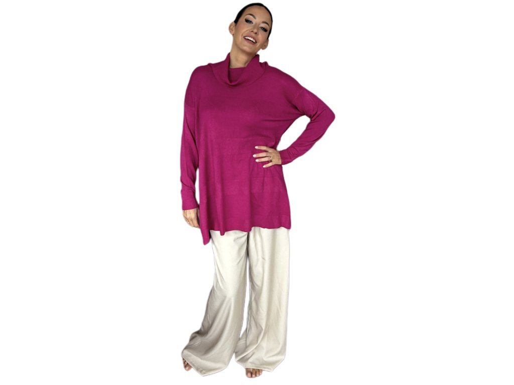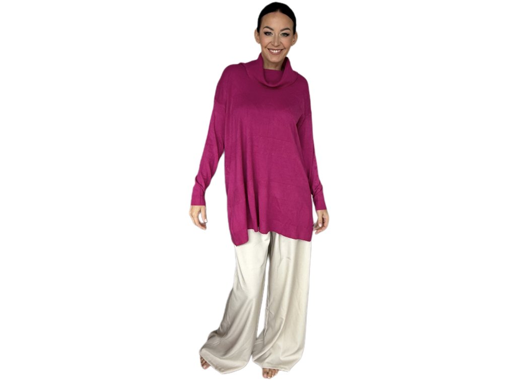 Tenká viskóza je hebká, prodyšná a krásně splývá po těle. Volnější střih s delší délkou lichotí postavě, schová co má a zároveň působí elegantně. Rolák jemně obepne krk, ale netlačí – ideální i na celodenní nošení.
