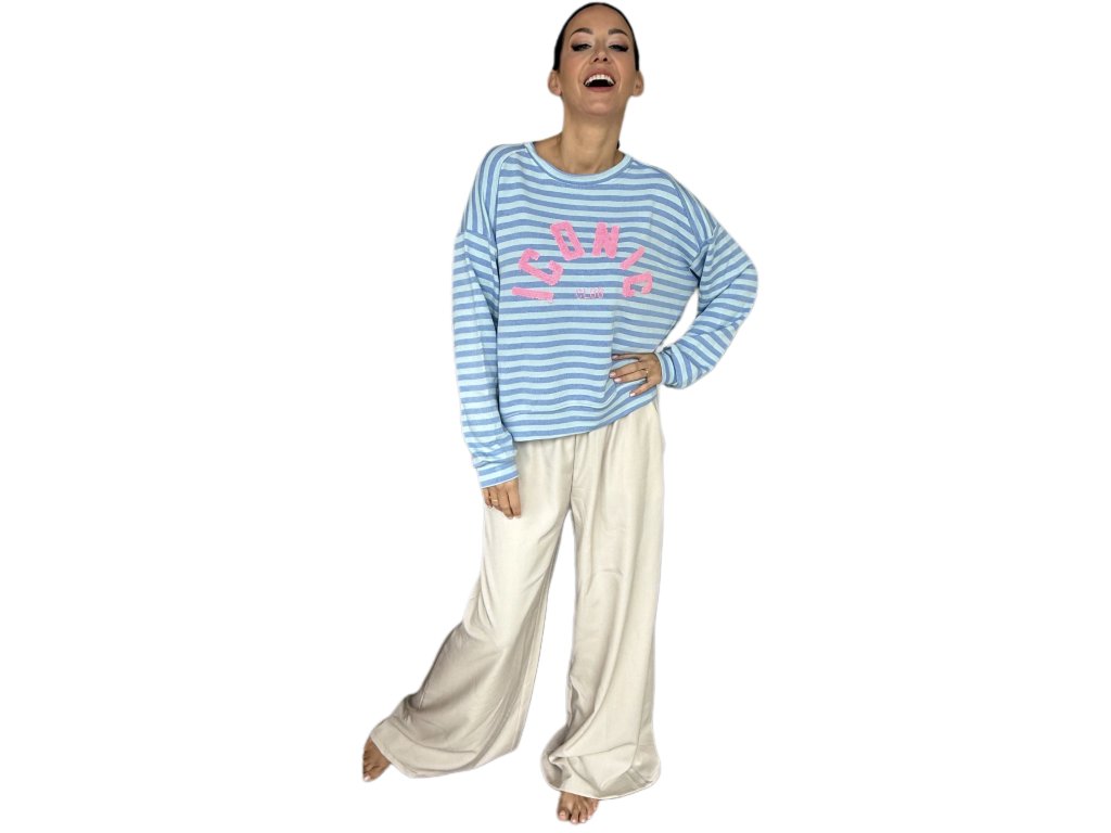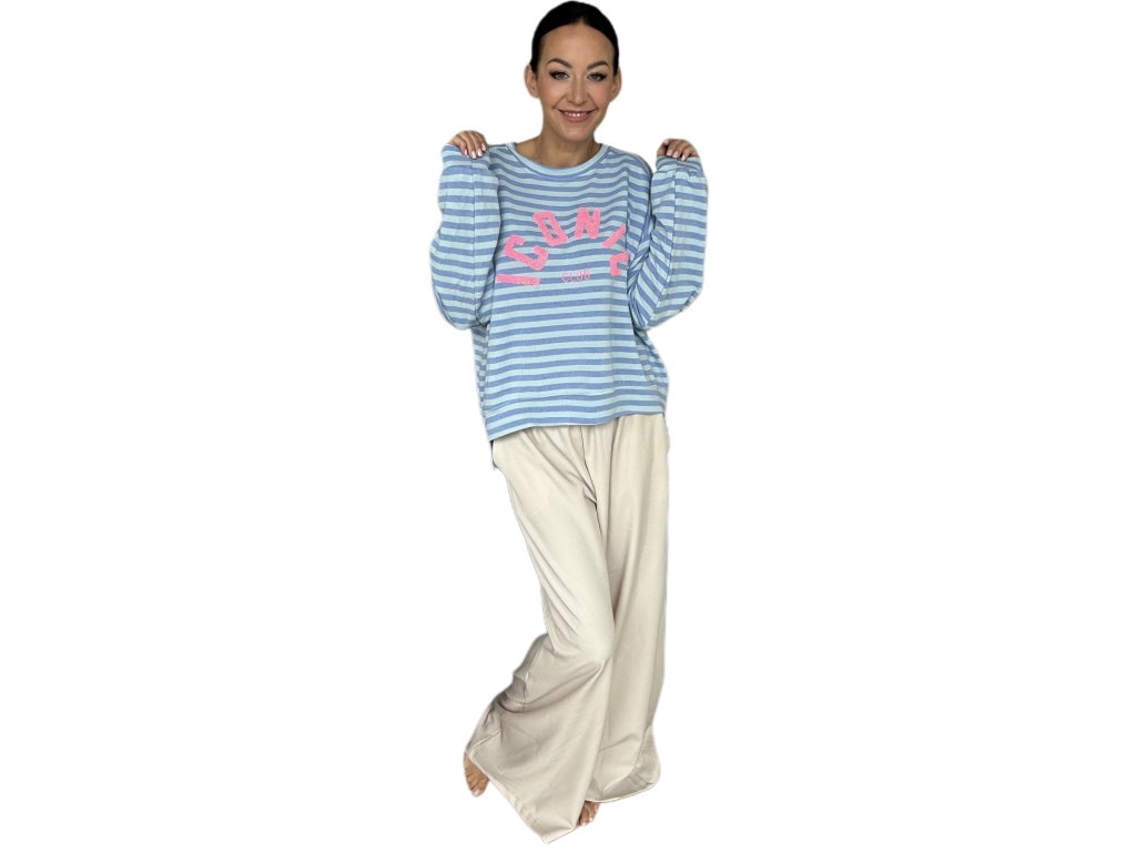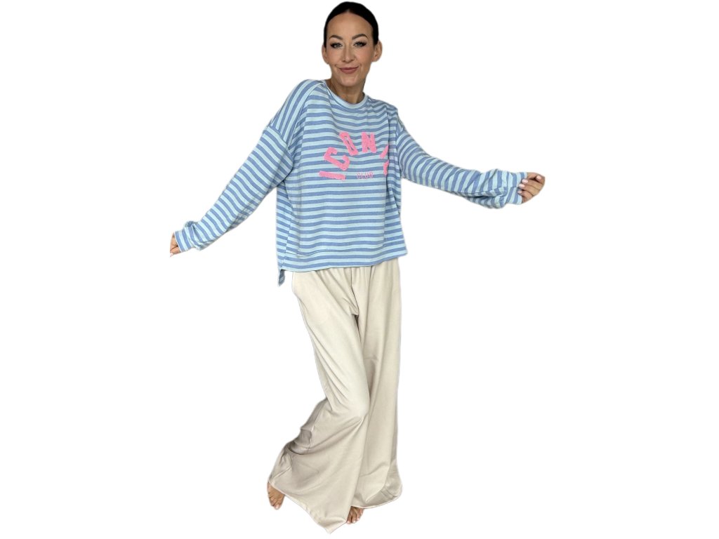 Stylová pruhovaná mikina, která spojuje pohodlí s hravým designem. Svěží barevná kombinace a výrazný nápis na přední straně dodávají outfitu mladistvý a optimistický vzhled.