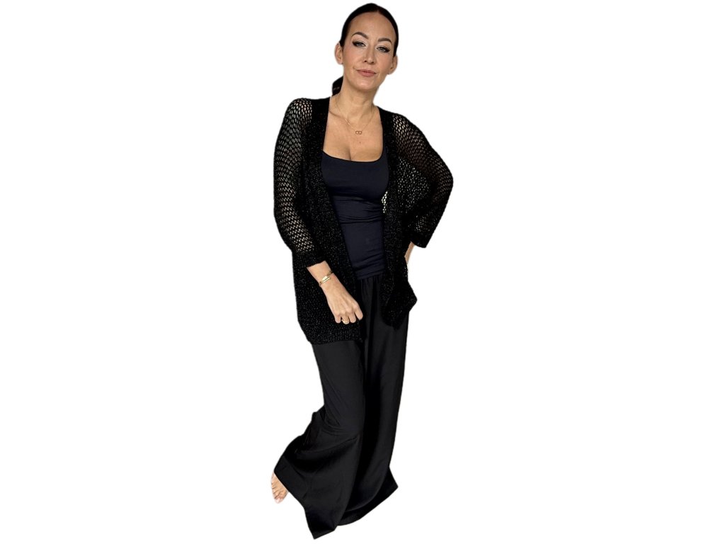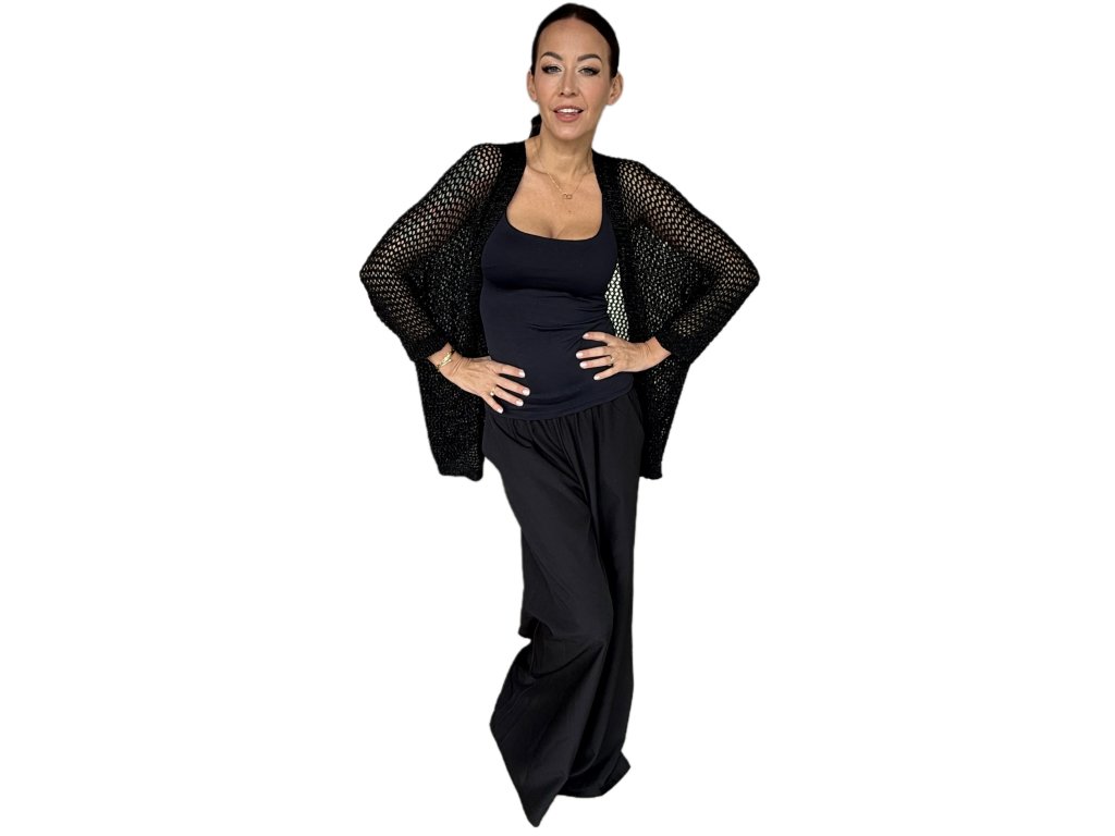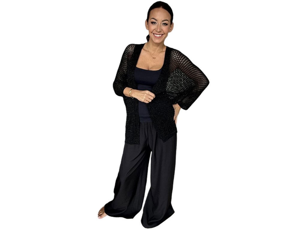 Volnější střih a splývavé rukávy podtrhují bohémský styl, zatímco černé provedení působí nadčasově a snadno se kombinuje s elegantními i ležérními kousky. Kardigan je ideální jako lehká vrstva přes top, šaty nebo plavky během teplejších dnů i večerů.