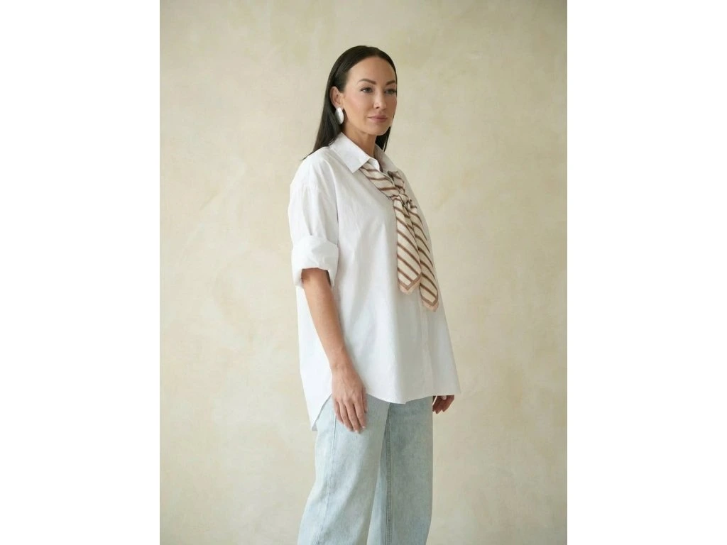 Elegantní bílá košile doplněná stylovým šátkem u krku, která dodává outfitu jemný francouzský šarm. Volnější střih a příjemný materiál zajišťují pohodlí i nadčasový vzhled.