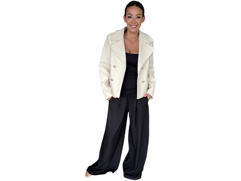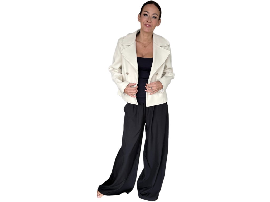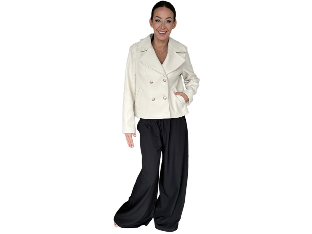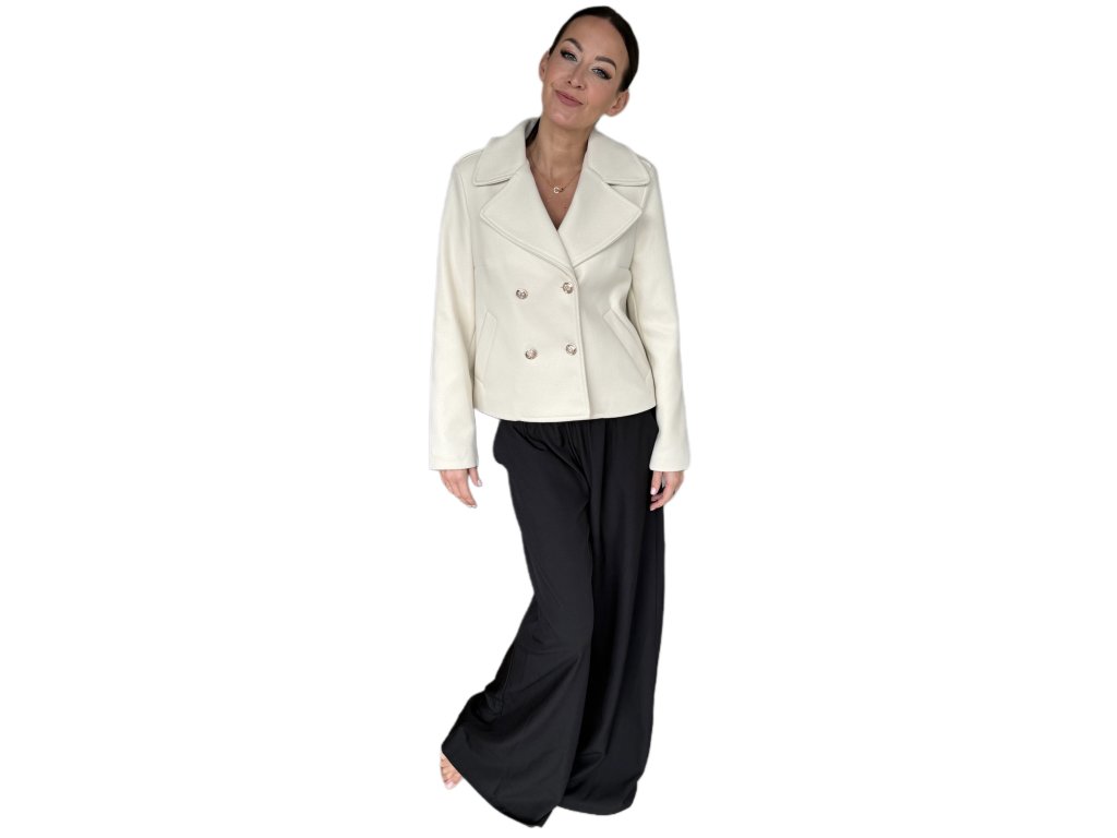Stylový dámský kabátek kratšího střihu v atraktivní bílé barvě představuje ideální kombinaci elegance a praktičnosti. Vyznačuje se dvojřadým zapínáním s ozdobnými knoflíky, výrazným límcem a pohodlnými kapsami, které podtrhují jeho nadčasový charakter. Precizní střih lichotí postavě a umožňuje snadné kombinování s kalhotami i sukní, takže se hodí jak do práce, tak pro volnočasové nošení. Tento kabátek je perfektní volbou pro ženy, které chtějí působit upraveně, sebevědomě a stylově v každé situaci.