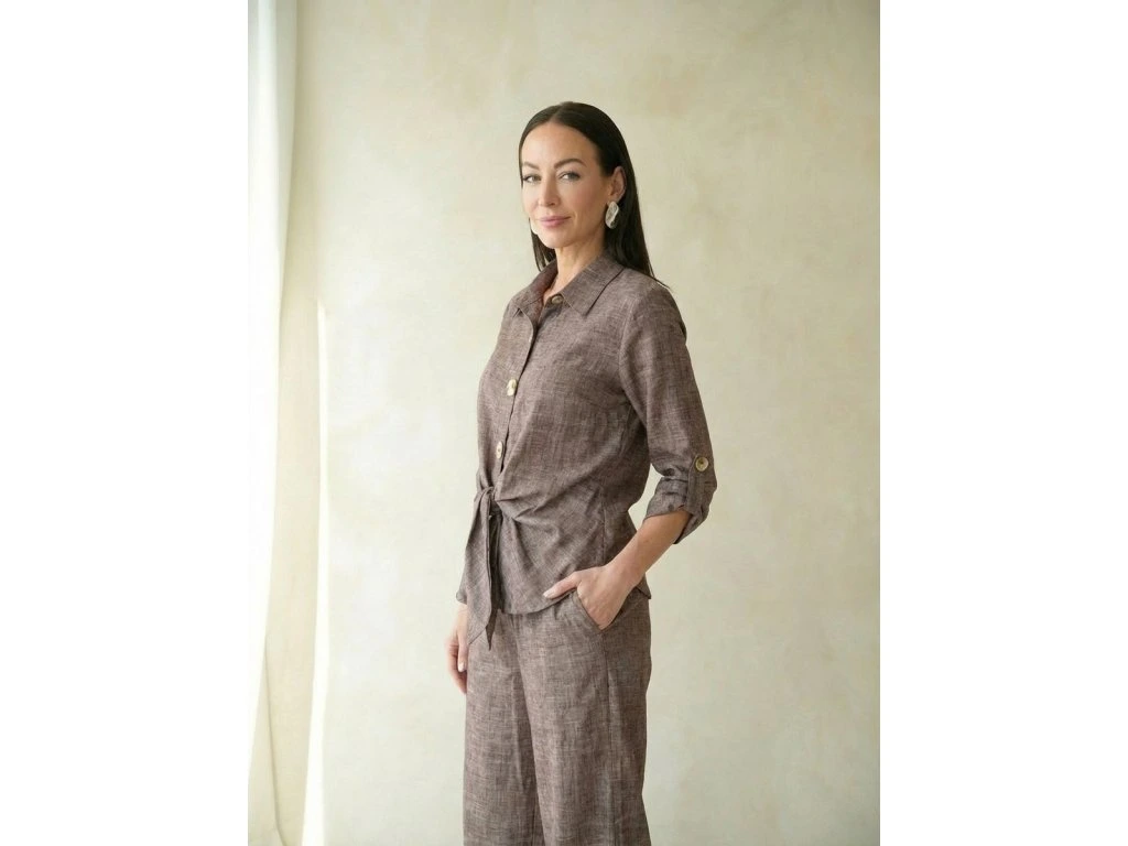 Portofino elegant set je sofistikovaný dámský komplet, který spojuje pohodlí, ženskost a nadčasovou eleganci. Skládá se z lehkého sáčka s límečkem a stylovým zavazováním v pase, které jemně zvýrazňuje siluetu, a ze širokých kalhot, které dodávají celému outfitu vzdušnost a moderní vzhled.