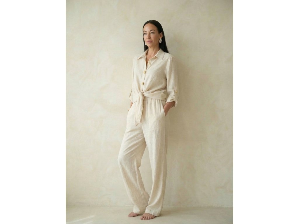 Portofino elegant set je sofistikovaný dámský komplet, který spojuje pohodlí, ženskost a nadčasovou eleganci. Skládá se z lehkého sáčka s límečkem a stylovým zavazováním v pase, které jemně zvýrazňuje siluetu, a ze širokých kalhot, které dodávají celému outfitu vzdušnost a moderní vzhled.