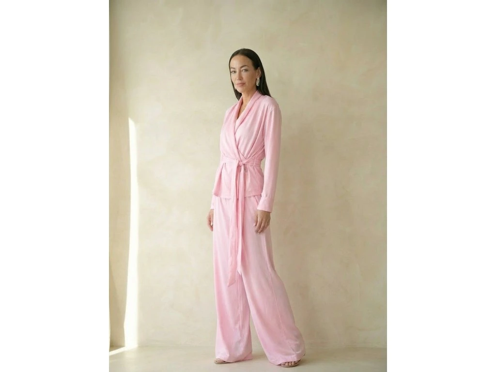 Elegantní dámský komplet Silky Grace – Hot Pink v ikonickém růžovém odstínu, který působí ženskě, stylově a nepřehlédnutelně. Lehké sáčko se zavazováním v pase a splývavé široké kalhoty vytvářejí luxusní a velmi pohodlný outfit.