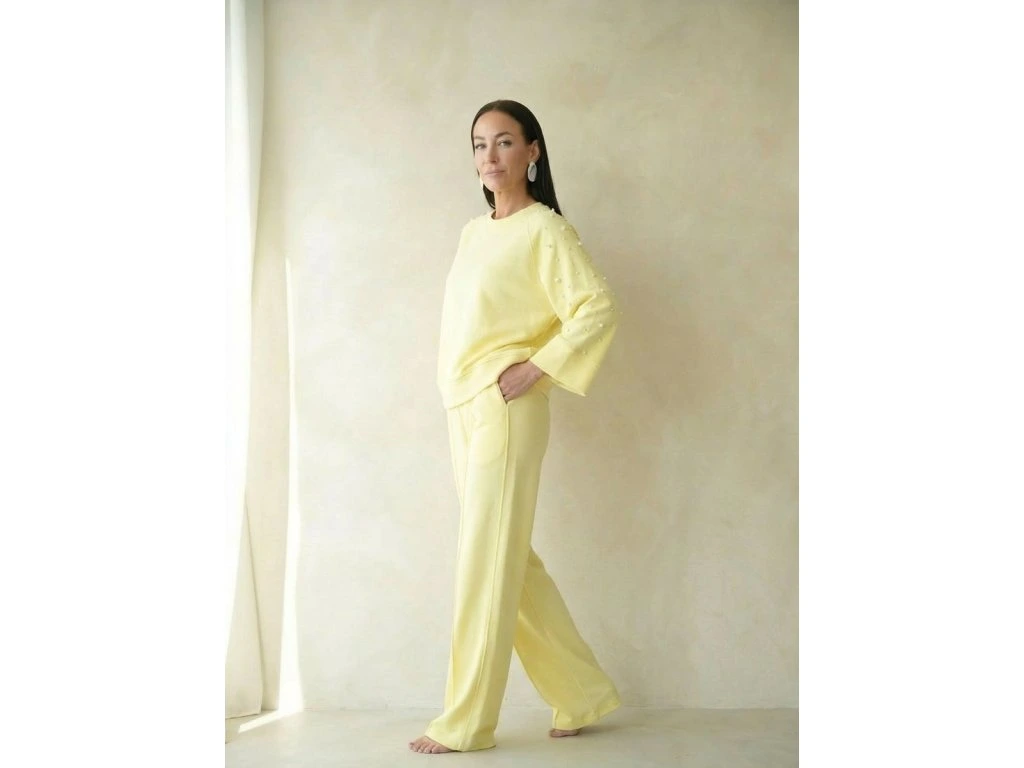 Elegantní dámský komplet v jemném světle žlutém odstínu zdobený perličkami spojuje pohodlí s decentním luxusem. Ideální volba pro stylové každodenní nošení i chvíle odpočinku.