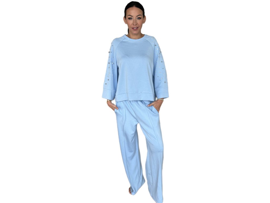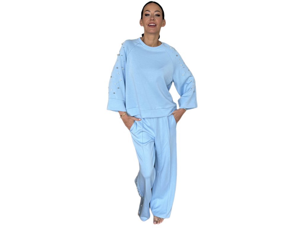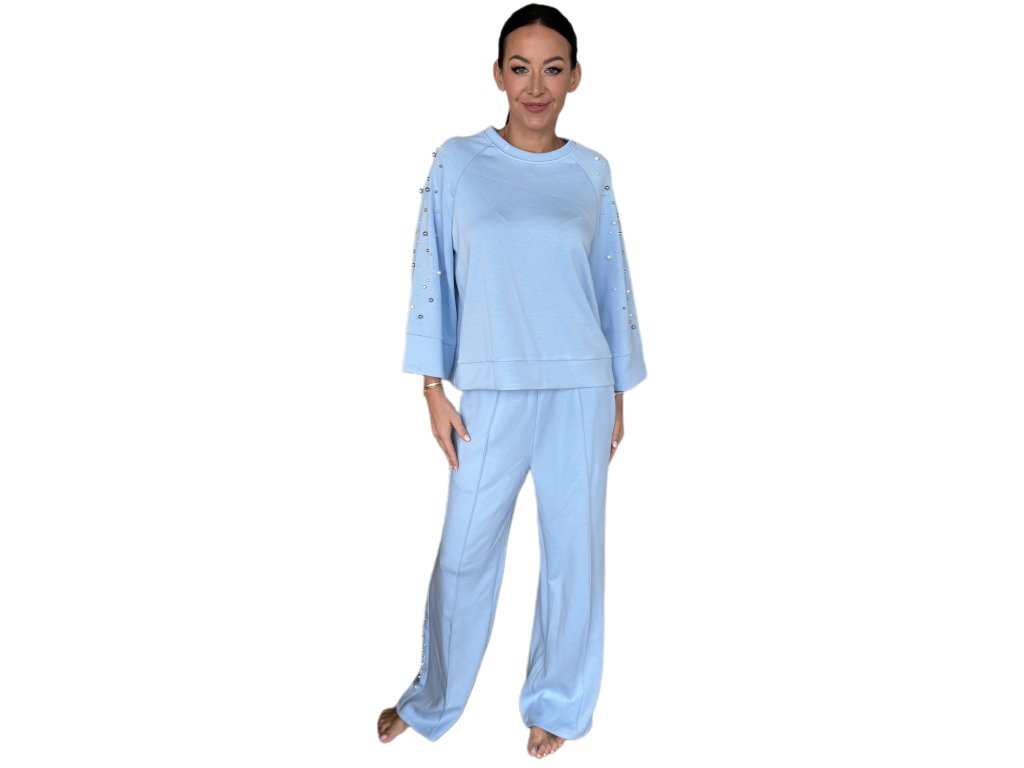 Elegantní dámský komplet v jemném světle modrém odstínu zdobený perličkami spojuje pohodlí s decentním luxusem. Ideální volba pro stylové každodenní nošení i chvíle odpočinku.